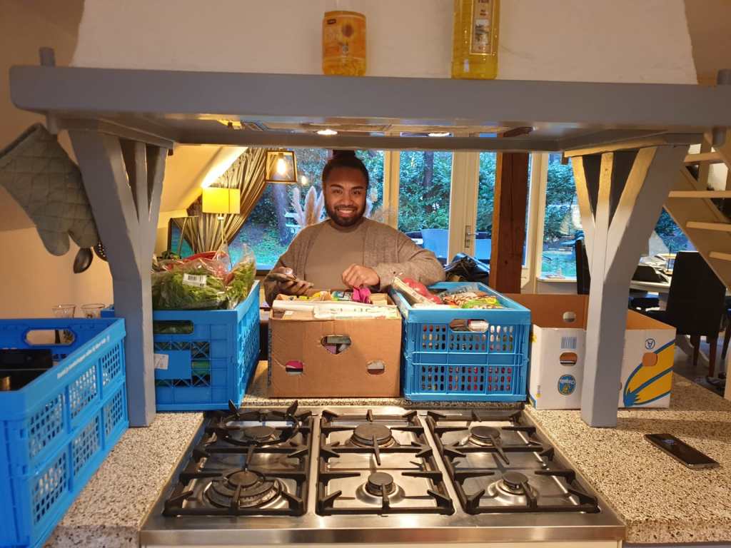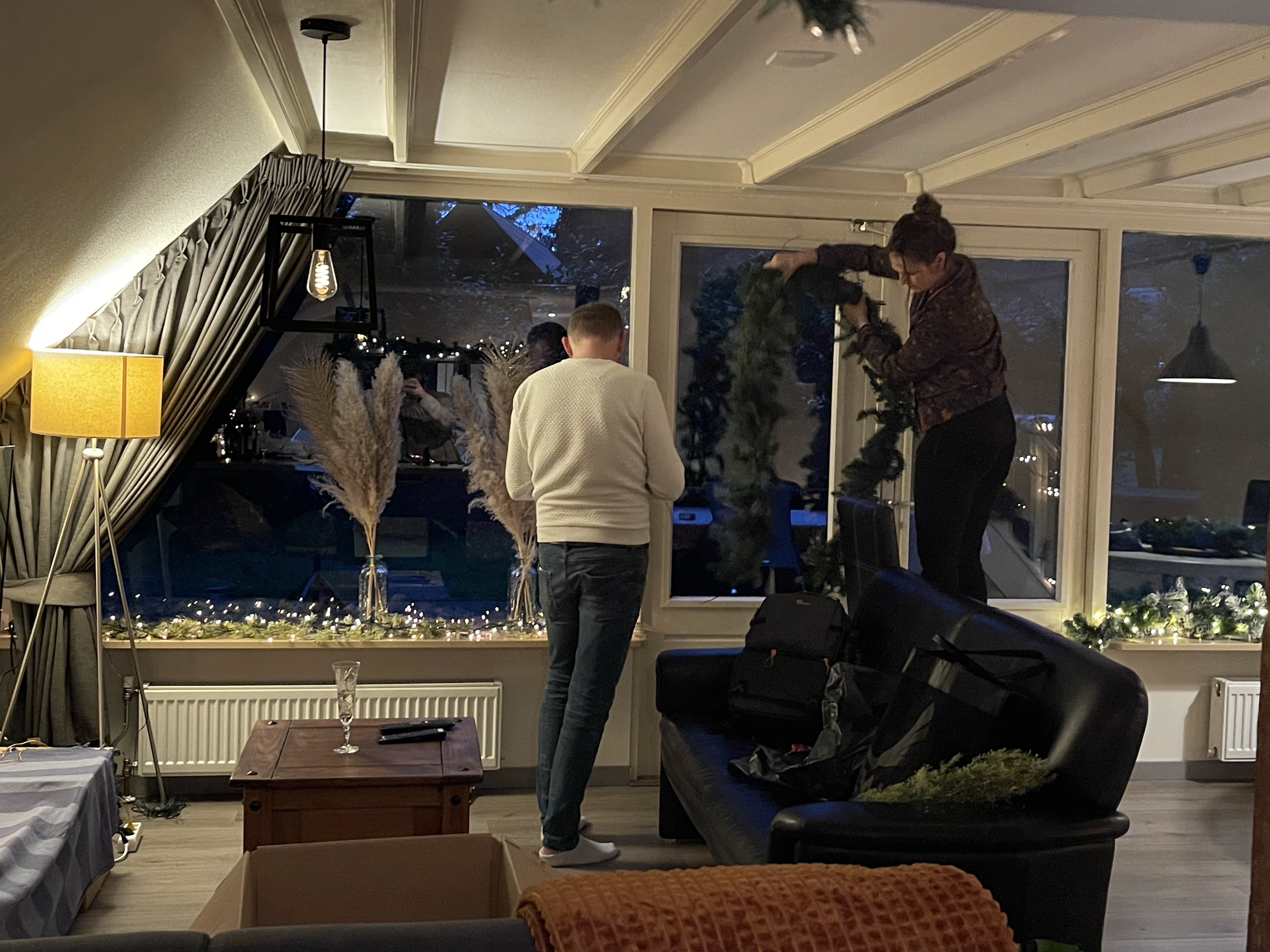 Okee genoeg gekletst! Alles moet nog uit de auto gepakt worden. Voor het vakantiehuis hebben Marieke en Adriaan dozen vol met kerstversieringen meegenomen. Het huisje wordt in kerstsferen gebracht… heel leuk! Dit geeft natuurlijk het ultieme kerstgevoel. De guirlandes en lichtslangen worden zorgvuldig en in goed overleg opgehangen door het duo. En Ozje… hem niet bellen! Hij pakt de keuken wel in… Adriaan heeft namelijk de hele inboedel in dozen gepakt. Kristallen glazen, gouden bestek, zijn hele drank voorraad en als het aan hem had gelegen ging zijn retro servies ook mee… En wat dacht je van de boodschappen: Er is voor bijna 300 euro aan kerstboodschappen ingeslagen! En over misgrijpen gesproken, bij het uitpakken van de boodschappen ontdekt Ozje dat er iets niet klopt. Marieke en Ozje hebben de zelfde boodschappen gehaald terwijl er duidelijke lijstjes zijn gemaakt. En… de essentiële producten die zijn vergeten! Dat wordt het hele weekend roomkaas en sojaslagroom eten hahaha… Wij trekken een fles prosecco open om dit zoo snel mogelijk te vergeten en om het kerstweekend in te luiden.