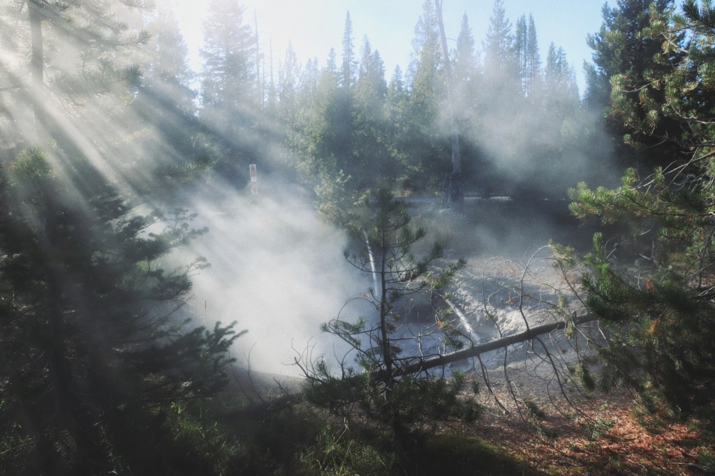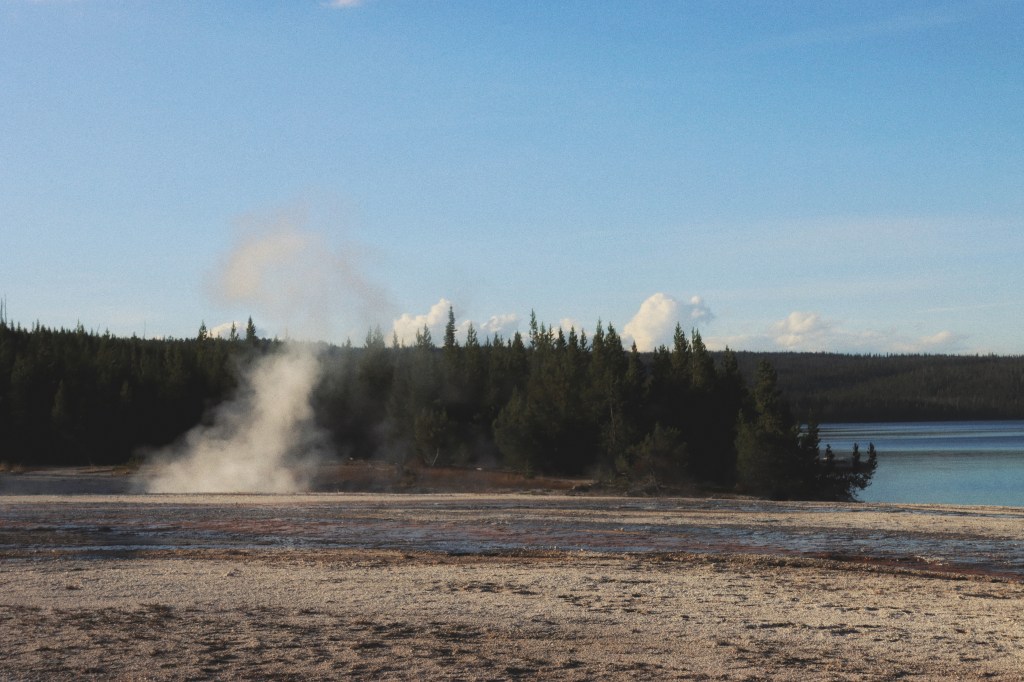 En dat blijkt een goede keuze. We gaan naar de West Thumb waar we een wandeling maken over het geyser basin. Het is het gouden uurtje waardoor we prachtig zonlicht hebben op de ontelbare kleine en grote geisers. En bovendien spotten we onderweg verschillende wilde dieren, zoals chipmunks en herten. Dat maakt onze dag weer een beetje goed!