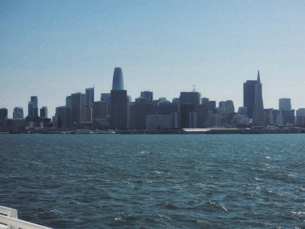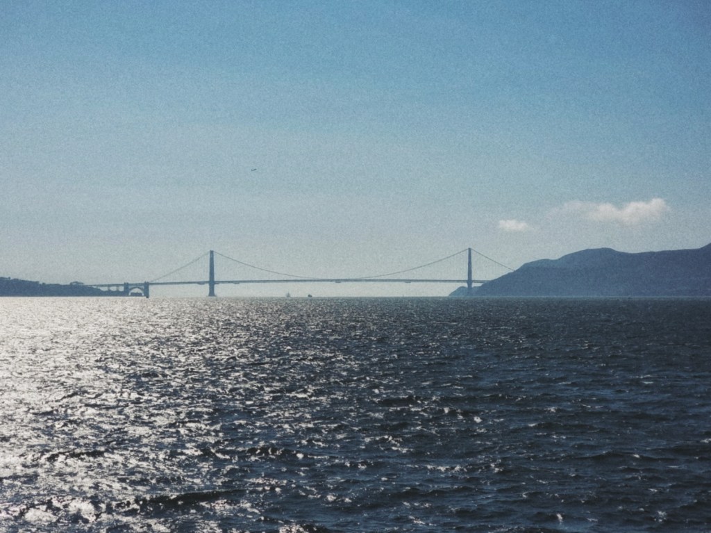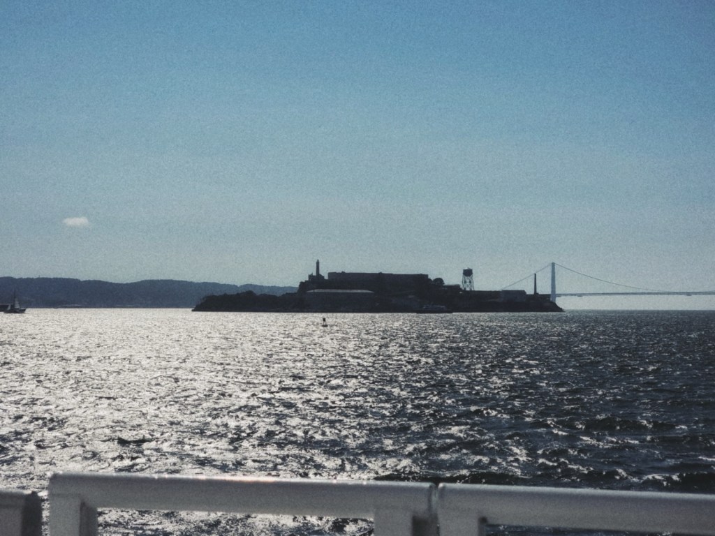 Na een kopje koffie gaan we meteen op pad en volgen te voet de route naar de ferry. Die is ongeveer op 10 minuten loopafstand. Ongeveer 100 meter voor ons loopt een echtpaar, die ook op weg is naar de ferry. We zouden zweren dat het Hollanders zijn, want de vrouw in kwestie heeft een typisch Nederlandse kont valt ons op. En wat denk je, komen ze bij de ferry naar ons toegelopen, blijken het inderdaad nederlanders te zijn. Niet te geloven toch. Ze vertellen dat ze in 1982 naar Amerika zijn geëmigreerd. Maar ondanks al die jaren spreken ze nog vloeiend Nederlands. Na onze gezellige chitchat komt de ferry eraan. De rit duurt ongeveer 45 minuten en is bepaald geen straf. De zon schijnt en glinstert in het woeste water. Onderweg varen we alvast langs 2 highlights van de stad: alcatraz en de beroemde Golden Gate brigde. Geweldig om zo via het water de skyline van de stad te zien.