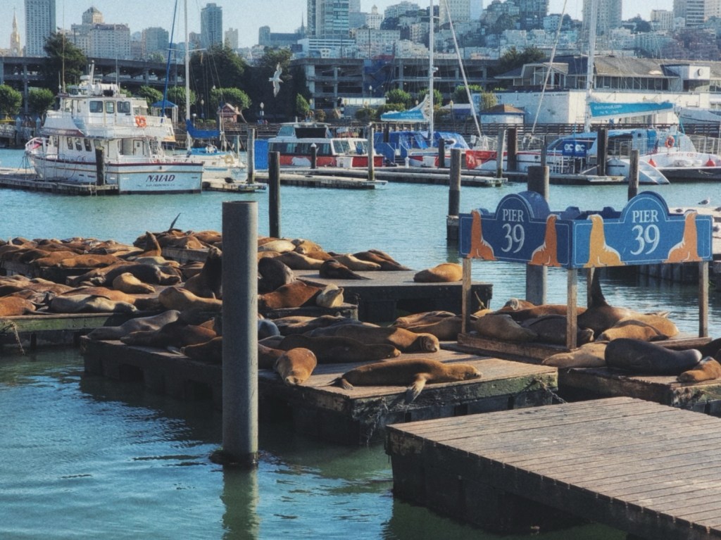 We meren aan bij de Port of San Francisco, waar we meteen het gezellige Ferry building marketplace oplopen, met lekkernijen, zoals verse groente, chocola en wijn. Buiten aangekomen springen wij op de bus, die heel grappig de vorm heeft van een cabrio volkswagen bus, maar dan in touringcar formaat. Deze brengt ons naar de beroemde Pier 39, met zijn gezellige winkeltjes, zoals een kerstwinkel en een winkel speciaal voor linkshandigen (lefty’s). Waar vind je dat nou?! Ook bezoeken wij op de pier een plek waar we pelikanen spotten en welke ook een rustplaats is voor tientallen zeeleeuwen. Het zijn wilde dieren, die hier sinds 1990 hun vaste rustplaats hebben. Het is een aantrekkelijke plek, omdat ze hier een rustige plek hebben met vlonders waar ze op kunnen rusten, genoeg te eten en bescherming tegen roofdieren.