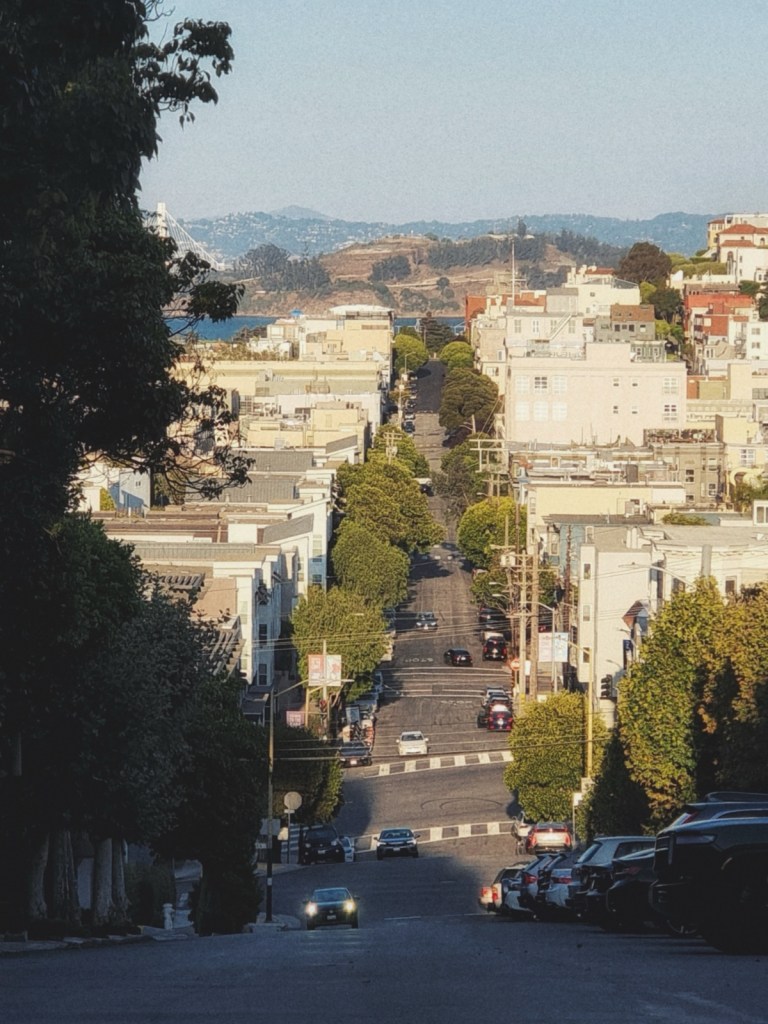 Na de pier gaan wij verder om San Fransisco te verkennen. Er hangt een verraderlijke kustwind dus Zeth koopt een hoody. Tja, je moet wat als je je human nature trui bent vergeten. Aad en Marieke hebben het liever koud dan geld uit te geven aan een trui. Je kunt wel zien wie de winst in het casino heeft gemaakt en wie niet.. Maar goed, van een stevige wandeling krijg je het ook warm. Zeker als je de steile stralen van San Francisco kent. We lopen de hellingen op naar de meest bochtige straat ter wereld: Lombard street, die een hellingspercentage heeft van maar liefst 21,3 %. Een hele klim die vele toeristen trotseren, maar dan vooral met de auto. Met de rv zouden we de Haarspeldbochten nooit kunnen maken.