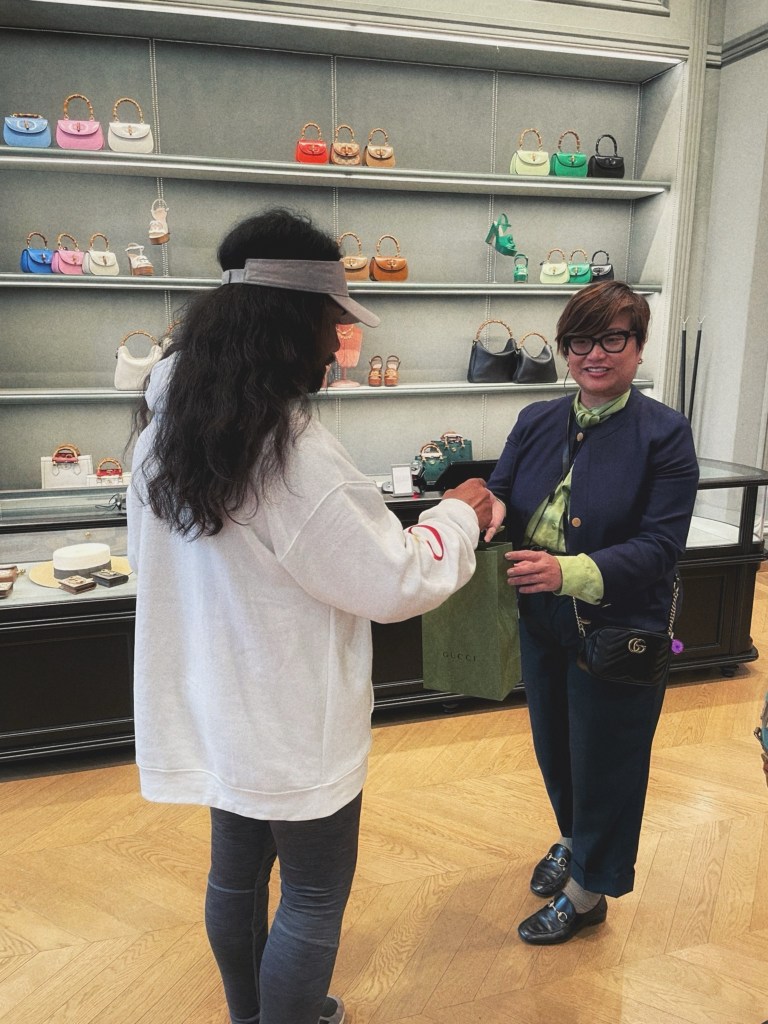 Tja en in dat rijtje kan de Guccistore natuurlijk niet ontbreken. Dus daar gaan wij natuurlijk even binnen. Zeker omdat het de grootste Guccistore ter wereld is, met zelfs een geïmporteerde lift uit Italië. Zeth kan de verleiding niet weerstaan om wat te kopen; een zijden sjaaltje voor als zijn tas het koud krijgt. Het is een raadsel hoe hij dat doet want hij roept al 3 weken dat hij bijna bankroet is. Maar goed hij stuurt Marieke en Adriaan gewoon een betaalverzoek voor een voorschot om zijn creditcard weer aan te vullen. Zogenaamd voor de benzine. Niemand die het doorheeft. Hij is immers de penningmeester en commissaris van benzinebeheer.