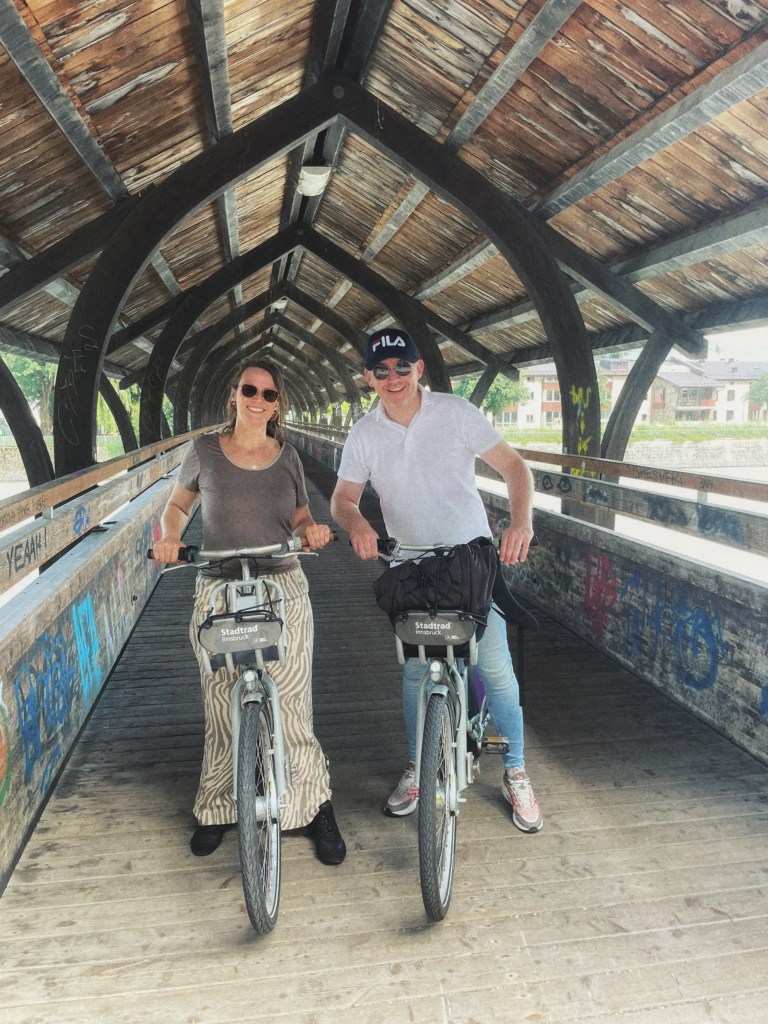 Na een halfuurtje shoppen stappen we weer op de fiets. Gelukkig staan ze er nog, want in dit leensysteem kan iedereen zomaar ‘jouw’ fiets pakken en dan sta je daar met je goede gedrag. Maar goed, bij ons gelukkig niet aan de orde. De terugweg met de wind in de rug is makkelijker; we fietsen over de rivier Inn (waar de naam Innsbruck van is afgeleid) en maken onderweg nog een praatje met een stel uit Colorado, Amerika. Been there! Het was trouwens heerlijk om op de traditionele overdekte houten brug boven de rivier af te koelen. Wat een heerlijke koele wind, want de hitte van de heenweg is ons niet in de koude kleren gaan zitten.