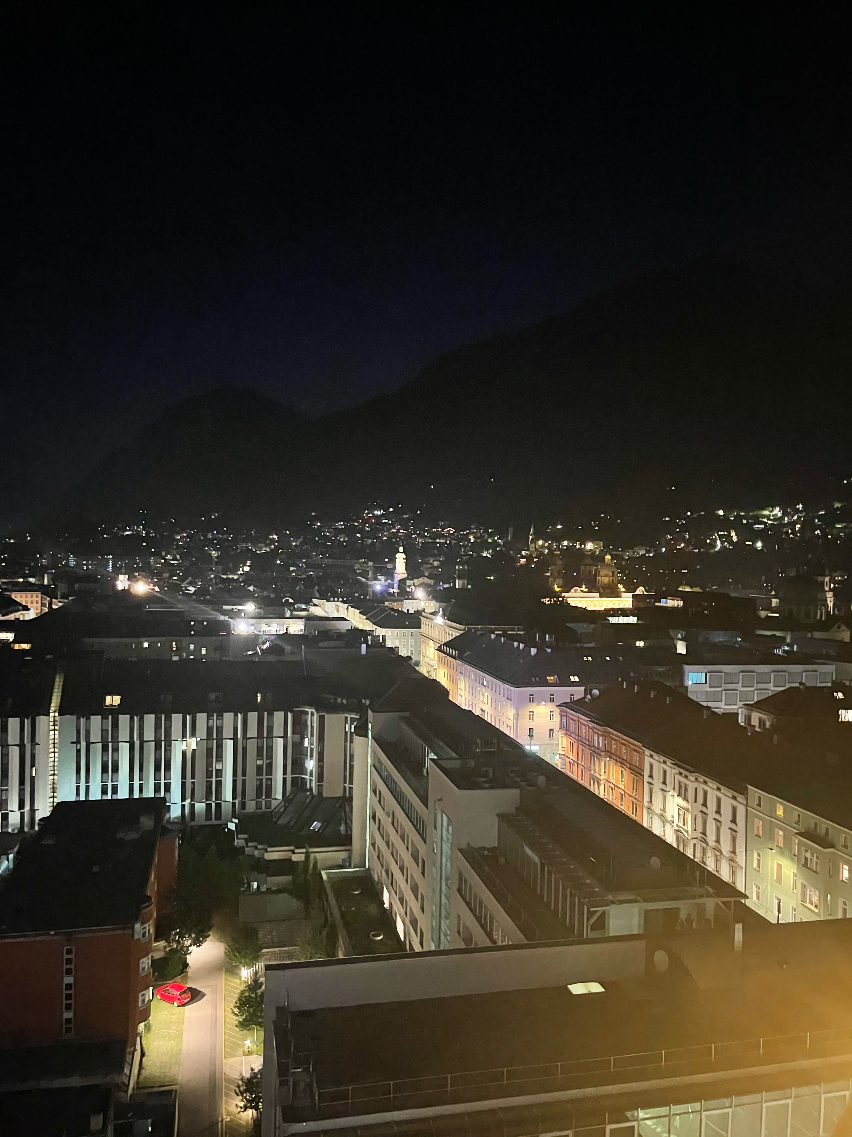In tegenstelling tot andere avonden zijn er deze keer geen chips, blokjes kaas en B&B Vol Liefde. Deze keer gaan we Innsbruck by night opzoeken. Marieke zou normaal al bijna twee uur slapen, maar deze keer maakt zij een uitzondering. Dus wij gaan allemaal douchen, make-uppen en de nette kleren aan. Zeth kiest voor een outfit zonder broek, maar gelukkig trekt hij bij aankomst in Innsbruck alsnog een spijkerbroek aan die in de auto lag. We moeten er wel een beetje stylish uitzien als we rond 22.30 uur de rooftopbar betreden. Deze bar bevindt zich op de 13de etage van het Adlers Hotel en biedt een prachtig uitzicht over Innsbruck. Terwijl we onze cocktails nuttigen, worden we vriendelijk begroet door de persoon naast ons. Het is de jongen die ons deze week heeft geholpen bij de Tiroolse Bijenkorf. Nu al vrienden gemaakt! We beloven dat we hem deze week nog in de winkel komen opzoeken. Dit geeft Zeth ook meteen een mooi excuus om toch zijn Coach tas te scoren.