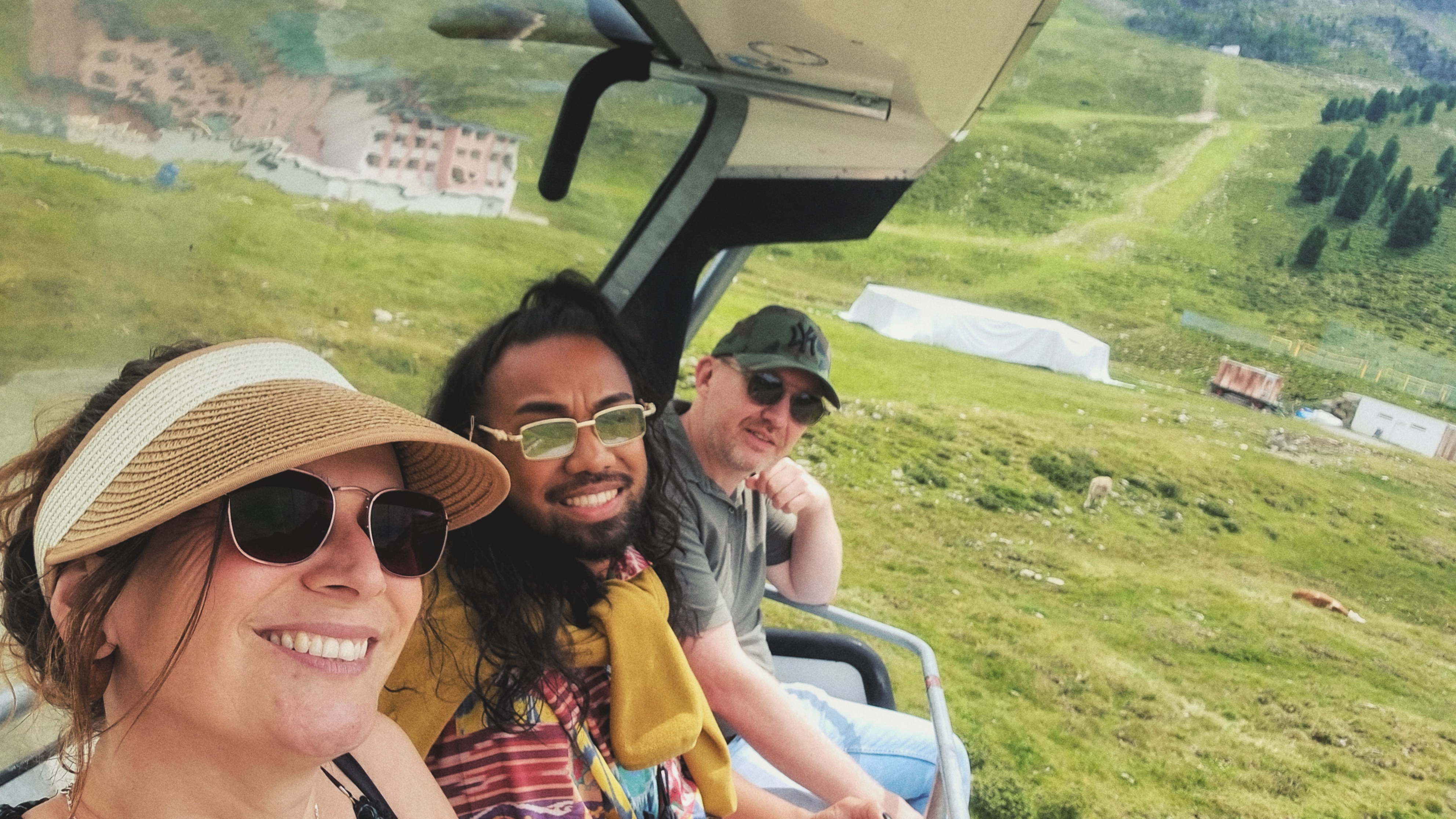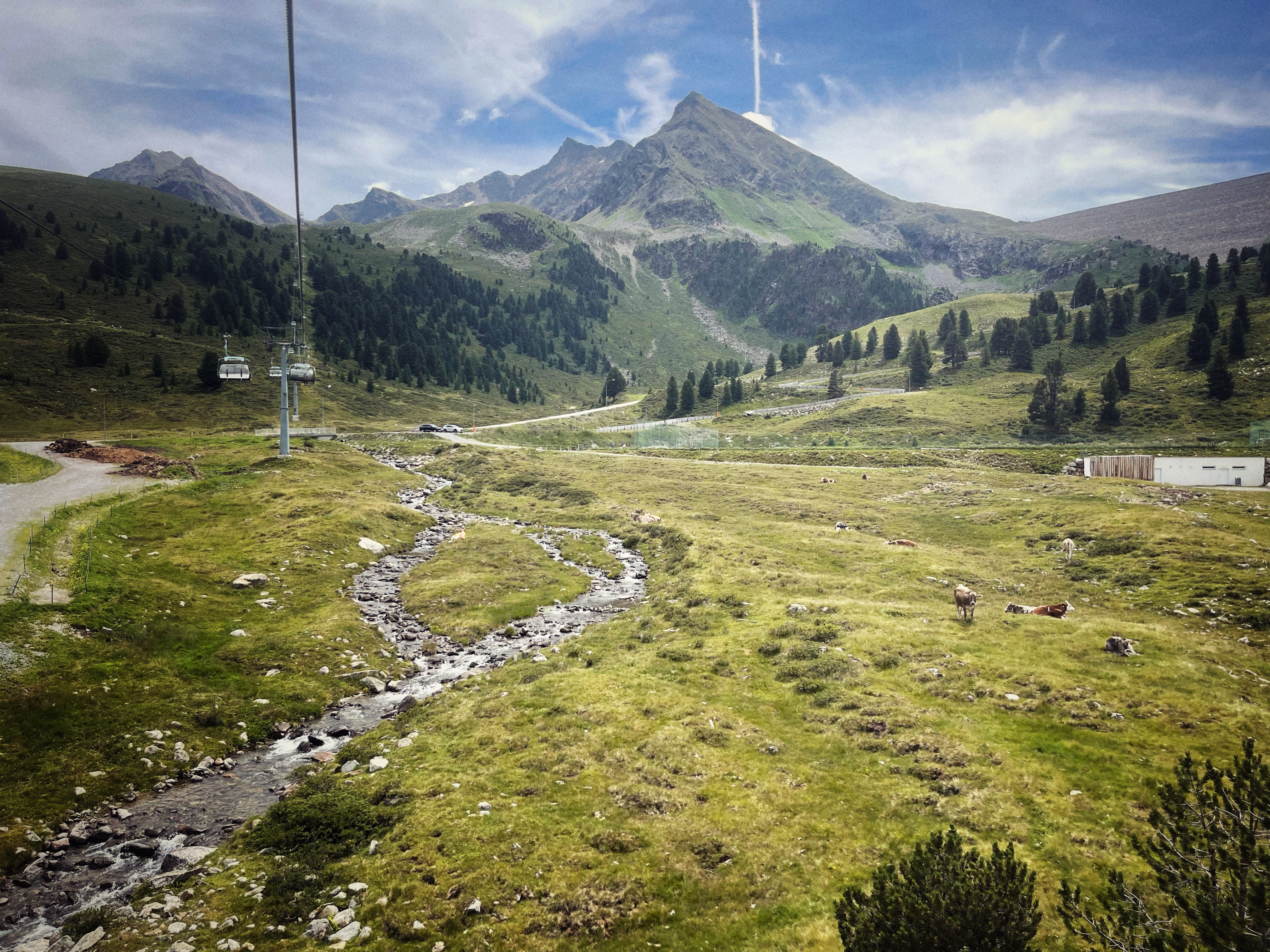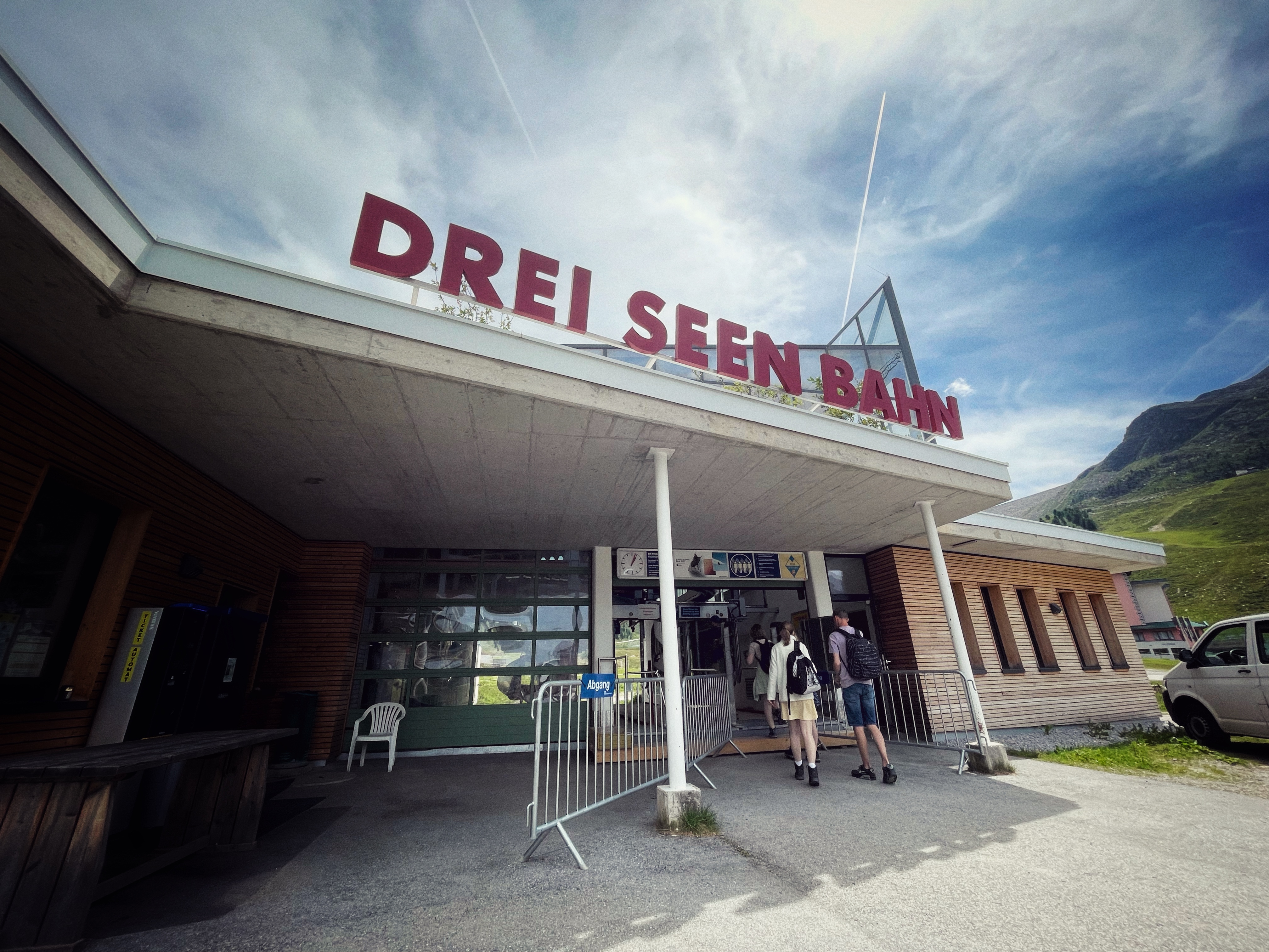 Om 12 uur rijden we richting Kühtai, een bergdorpje op 2200 meter hoogte, zo’n 40 minuten van ons huis. We nemen de Drei-Seen-Kabelbahn, waar we met onze welkomstkaart gratis gebruik van kunnen maken. Heerlijk in de buitenlucht met de stoeltjeslift, terwijl we ‘Top of the World’ zingen. Het wijdse uitzicht over de bergen met her en der nog wat sneeuw op de toppen, het blauwe bergmeer en de vele koeien met hun typische koebellen maken het Alpengevoel compleet. We zouden bijna gaan jodelen.