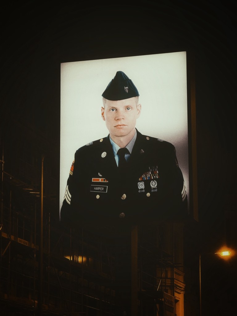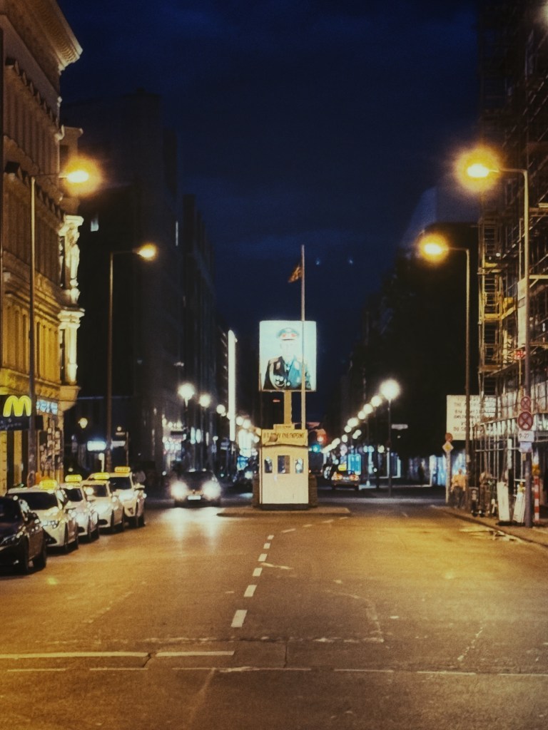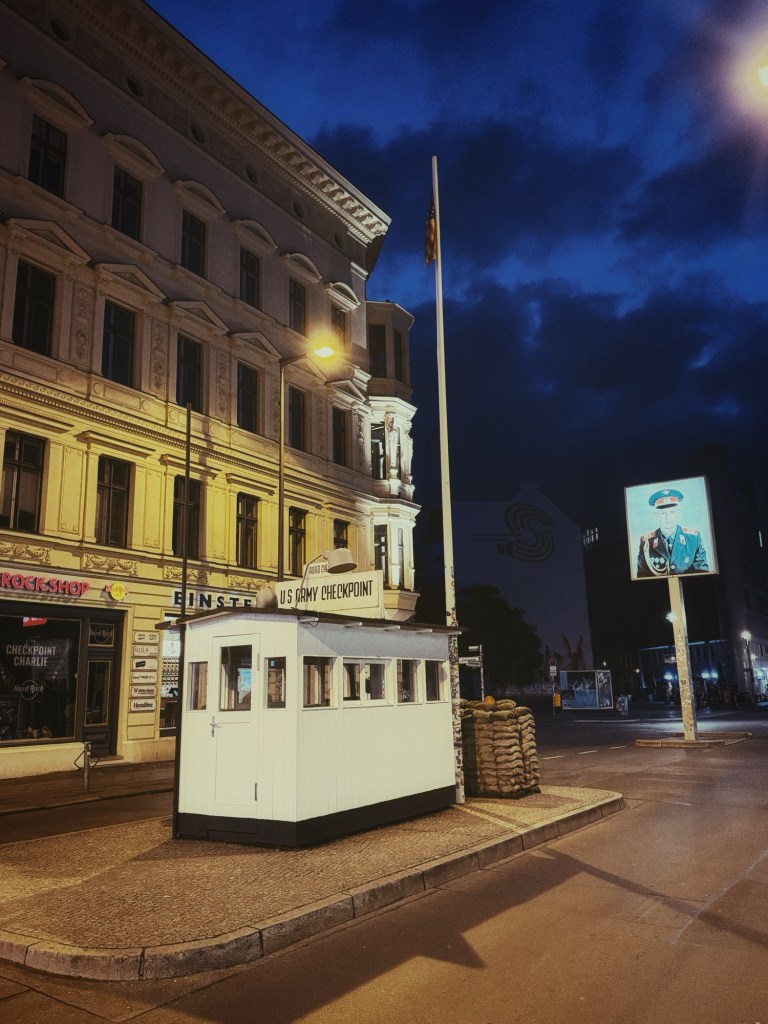 Wat we nu zien is een reconstructie van het originele wachthuisje. Een Amerikaanse vlag. Het beroemde bord: “You are leaving the American sector.” Belicht in de avondsferen waardoor het net iets meer karakter krijgt.