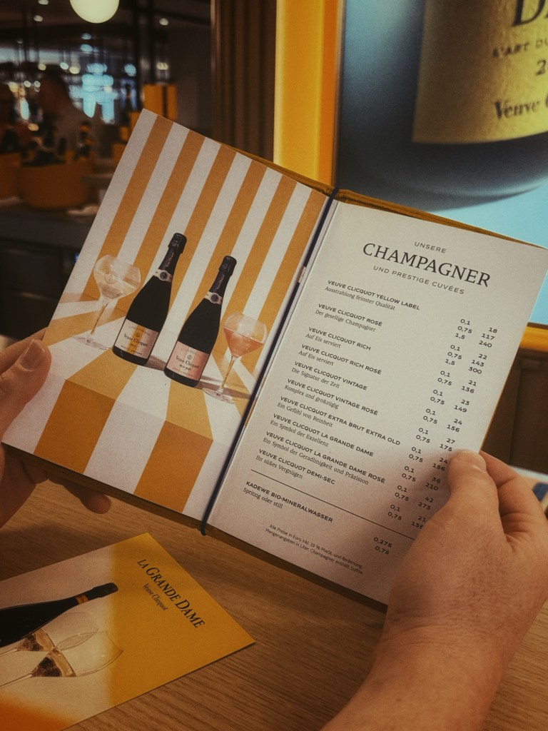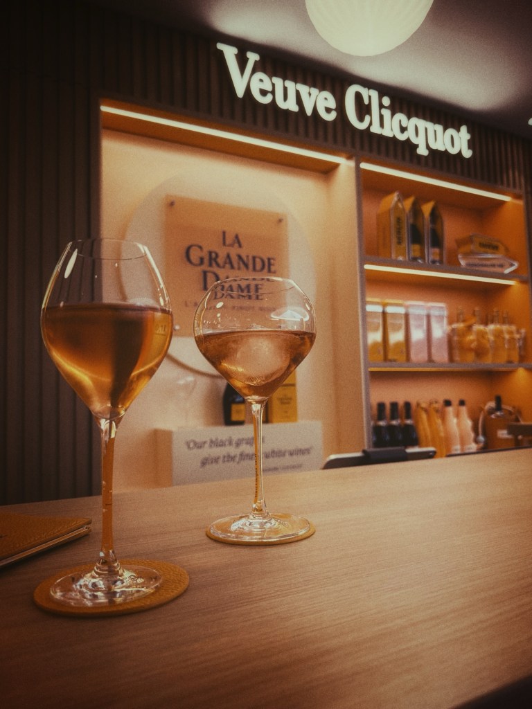 Na een uurtje shoppen besluiten we te proosten op het leven én op onze succesvolle aankopen. Dat doen we in stijl… bij de champagnebar van Veuve Clicquot.