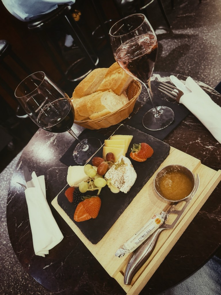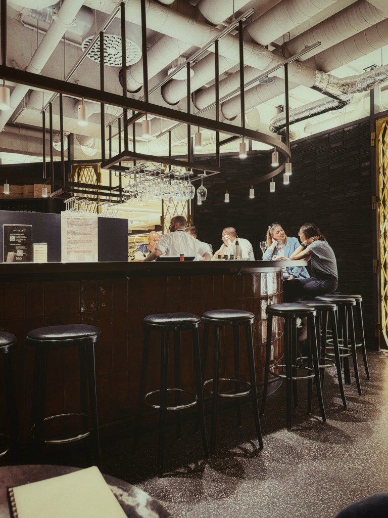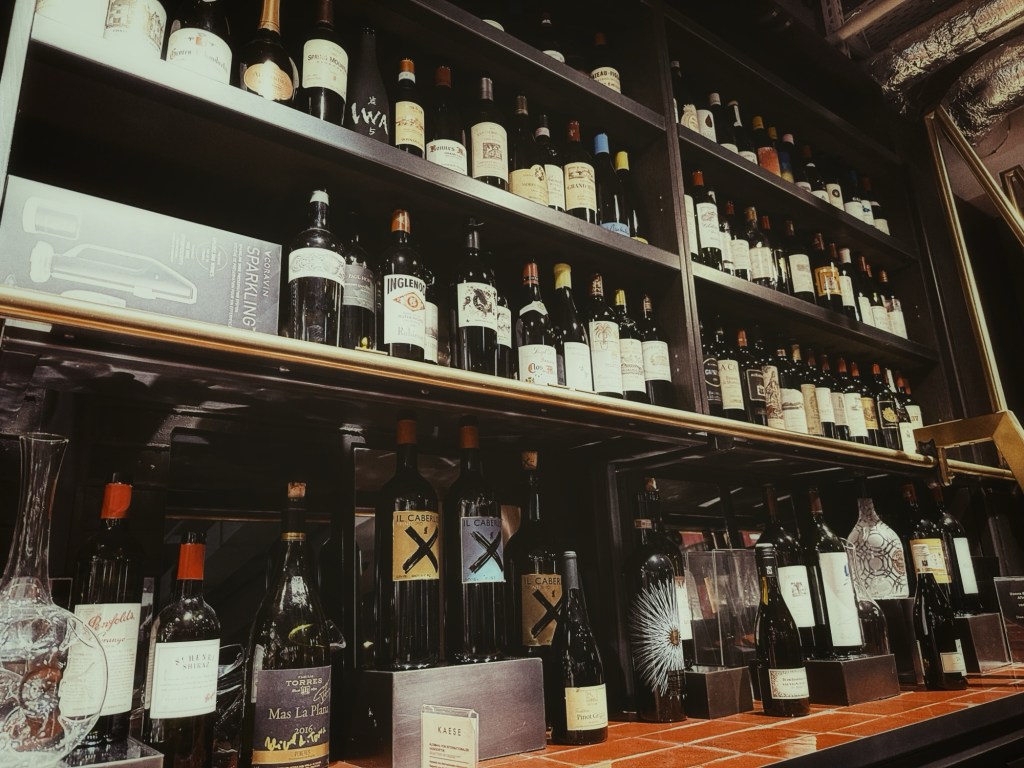 Maar onze vermoeide benen winnen het van onze winkelzin. Dus we keren terug naar het vertrouwde KaDeWe. We gaan gewoon weer lekker wijnen in de wijnbar. Cheers!