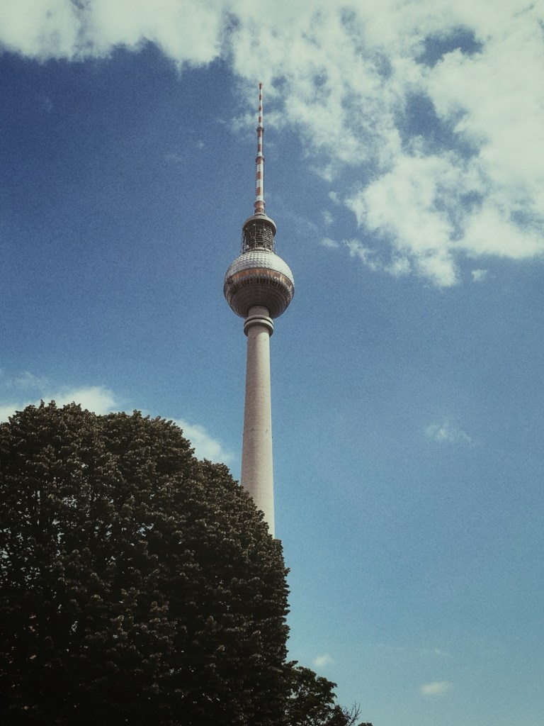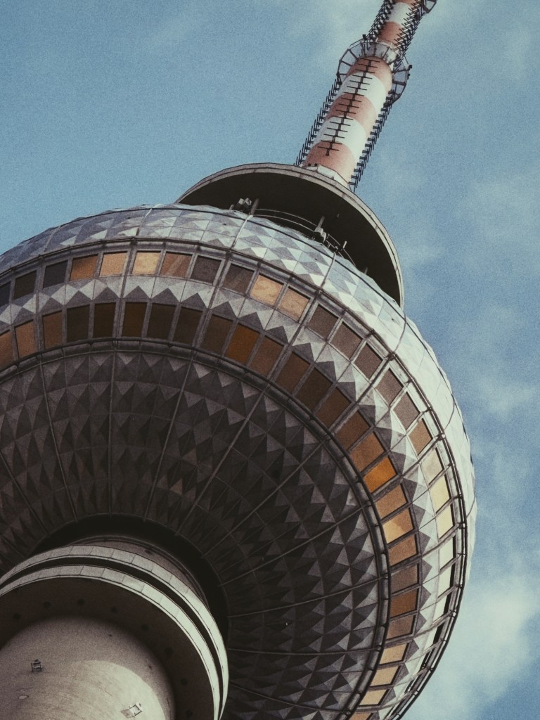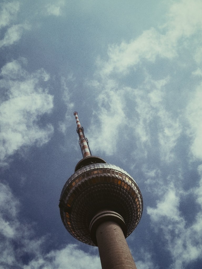 Eenmaal aangekomen bij de Fernsehturm kijken we omhoog… en omhoog… en concluderen dan: het is boven ons licht bewolkt. Maar het weer in de verte is grauw en bewolkt, en als je geen uitzicht hebt, is het vooral een dure lift omhoog.