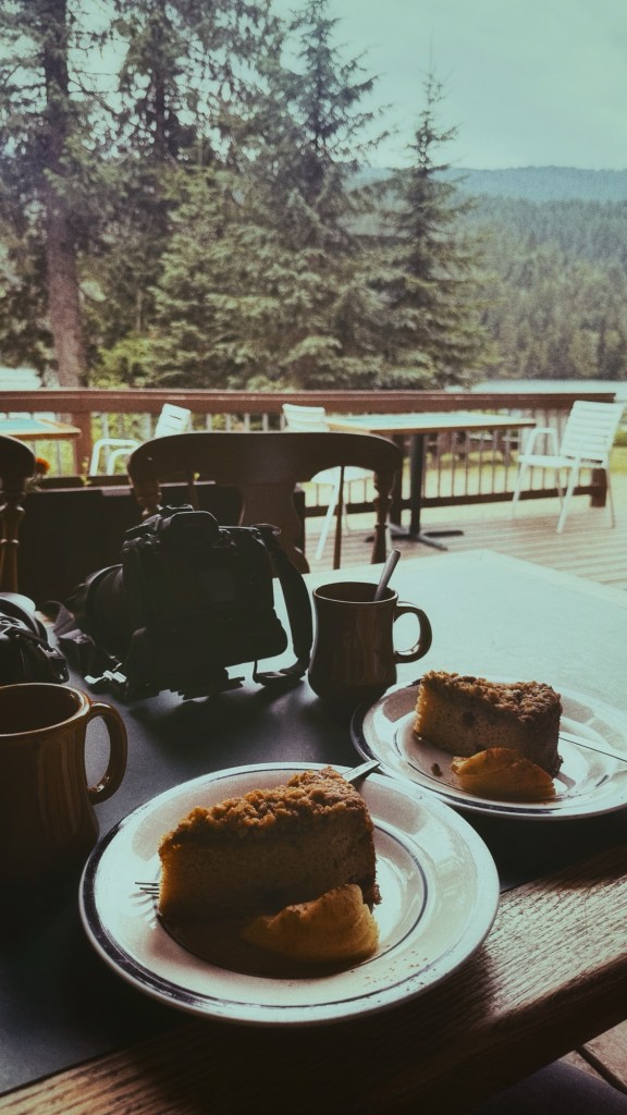 Het is 10:30 wanneer we aan de koffie zitten, met een stuk bosbessen kruimelgebak, in een ‘café’ aan het Clearwater Lake.